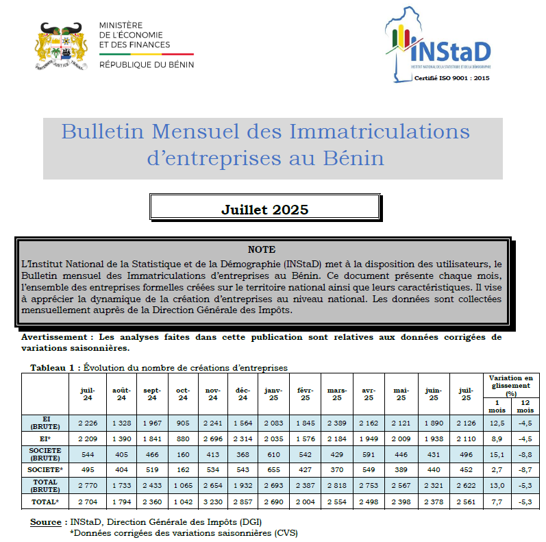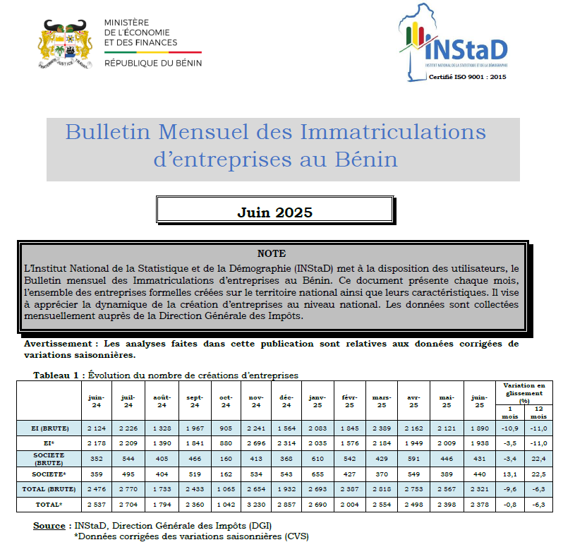 L’Institut National de la Statistique et de la Démographie (INStaD) a le plaisir de mettre à la disposition des utilisateurs, le Bulletin mensuel des Immatriculations d’entreprises au Bénin. Ce document présente chaque mois l’ensemble des entreprises formelles créées sur le territoire national ainsi que leurs caractéristiques. Il vise à apprécier la dynamique de la création d’entreprises au niveau national. Les données sont collectées mensuellement auprès de la Direction Générale des Impôts.