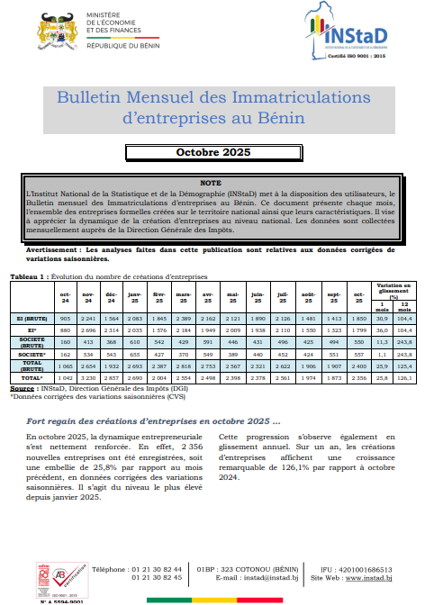 Bulletin mensuel des Immatriculations d'Entreprises au Bénin du mois d'octobre 2025