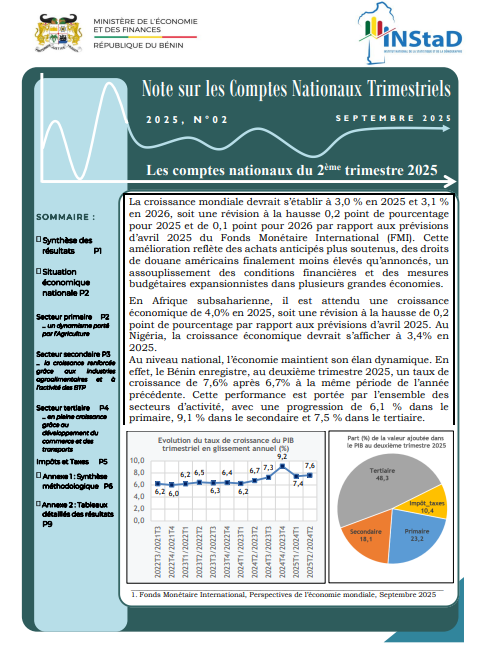 La croissance mondiale devrait s’établir à 3,0 % en 2025 et 3,1 % en 2026, soit une révision à la hausse 0,2 point de pourcentage pour 2025 et de 0,1 point pour 2026 par rapport aux prévisions d’avril 2025 du Fonds Monétaire International (FMI). Cette amélioration reflète des achats anticipés plus soutenus, des droits de douane américains finalement moins élevés qu’annoncés, un assouplissement des conditions financières et des mesures budgétaires expansionnistes dans plusieurs grandes économies. En Afrique subsaharienne, il est attendu une croissance économique de 4,0% en 2025, soit une révision à la hausse de 0,2 point de pourcentage par rapport aux prévisions d’avril 2025. Au Nigéria, la croissance économique devrait s’afficher à 3,4% en 2025. Au niveau national, l’économie maintient son élan dynamique. En effet, le Bénin enregistre, au deuxième trimestre 2025, un taux de croissance de 7,6% après 6,7% à la même période de l’année précédente. Cette performance est portée par l’ensemble des secteurs d’activité, avec une progression de 6,1 % dans le primaire, 9,1 % dans le secondaire et 7,5 % dans le tertiaire.